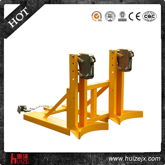 2.大圓弧托架 純機(jī)械機(jī)構(gòu)設(shè)計(jì)可與叉車(chē)方便地配合,僅依靠叉車(chē)的動(dòng)作,不需要其它的動(dòng)力,可自動(dòng)一次搬運(yùn)2個(gè)桶, 能處理更多類(lèi)型的桶,包括鋼制油桶和塑料油桶, 能在集裝箱等這樣狹小的環(huán)境內(nèi)裝卸桶裝物質(zhì),可極大地提高空間利用率, 與貨叉連接配有自鎖裝置確保油桶夾在坡度上和顛簸路面使用時(shí)不會(huì)滑落.